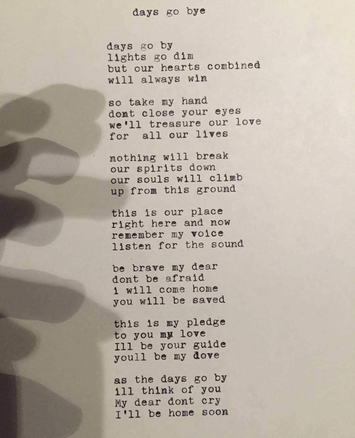 My first hundred or so poems were exclusively "love poems" neither directed toward any one person nor based on any real experience as I hadn't had even had a first kiss yet. The overly corny replacement of "by" for "bye" makes me cringe and I could not try to explain to you the inconsistent use of apostrophes. The syllabic count is nonsense and there is practically no imagery. However, this poem was also my first attempt to step into someone else's shoes. I wanted to capture the sense of love and sadness that soldiers would feel when leaving their lovers behind. In a sense, I think I was able to capture that in a meaningful way and so it stands out amongst my early work as a success. It may not be near to my standards today, but it was the essence of something and I still hold "days go bye" dear to my heart.