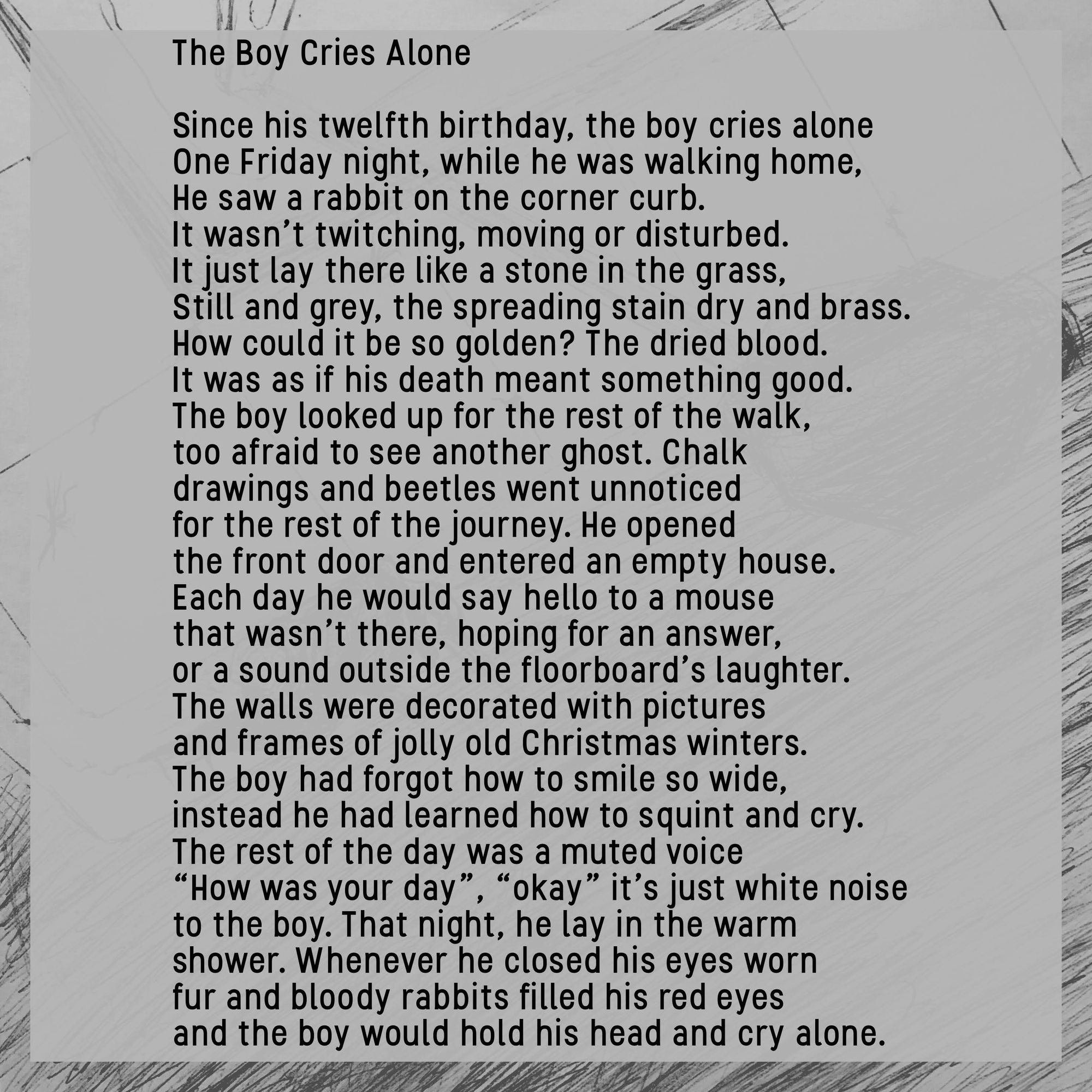 My art has always been seen as edgy and this poem really helps me understand why. In the moment, I never thought or think of these emotions as edgy but looking back I can see how, instead of writing a poem, I maybe just needed a glass of water and a hug.