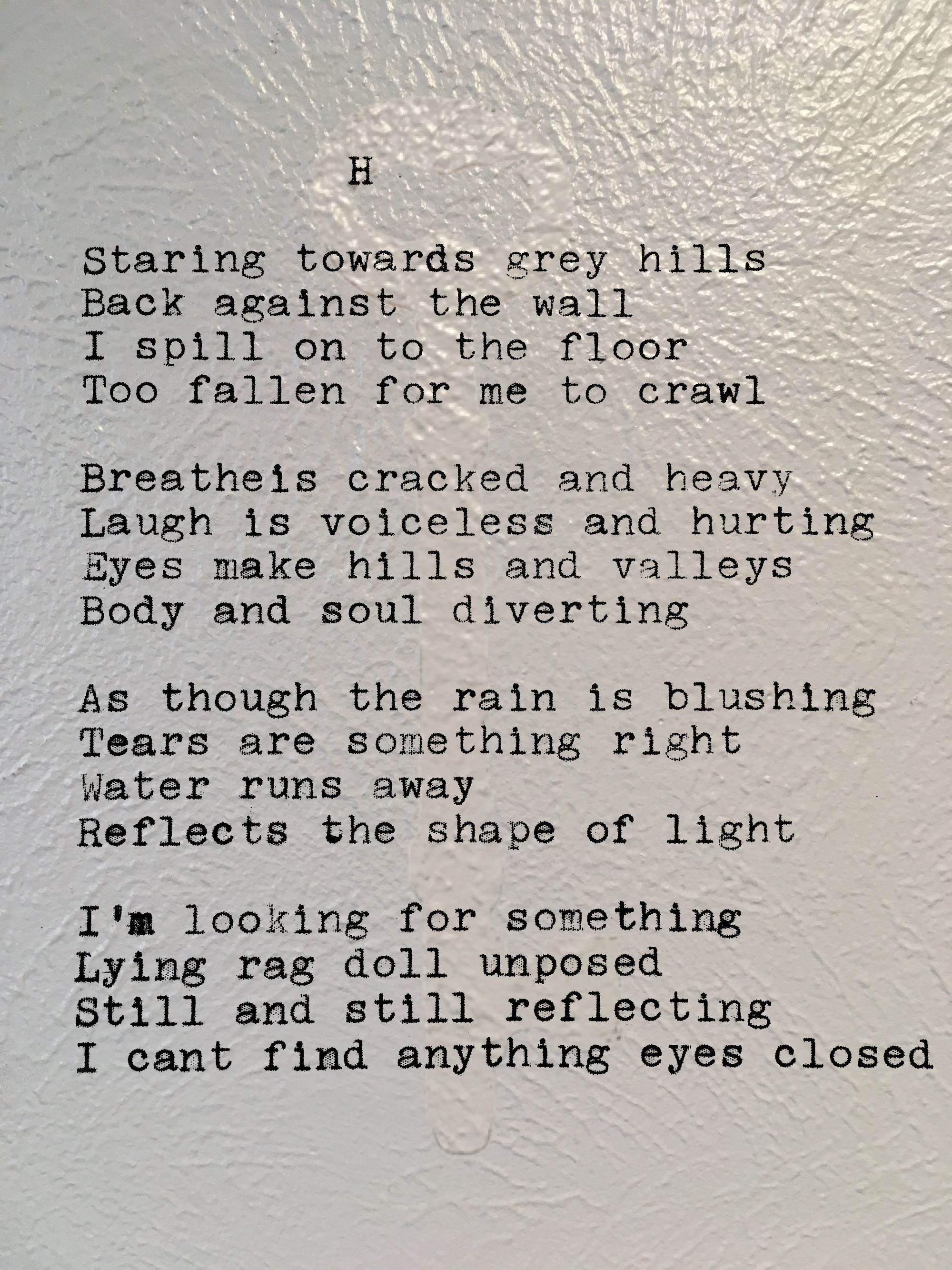 All my early work was written on a typewriter that I had purchased at an antique store in 2015. I remember being somewhat proud of the purchase and thus I subjected myself to writing every poem on a piece of paper letter by letter with no means of correction as my hands were too shaky to use whiteout. This resulted in a few letters literally being typed over others. I would restart each poem if a mistake was too noticeable, and in this particular piece I decided to ignore the misspelling of "My" in the third stanza and write over the stray "u".