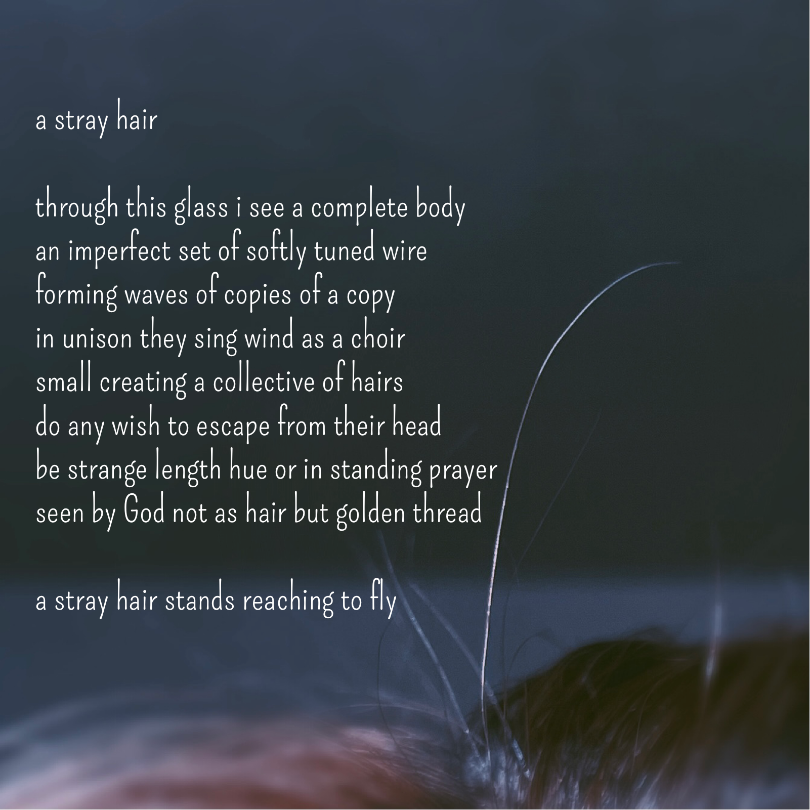 At the time of writing the poem, and, even now writing this post, I feel strange trying to write something unique or personal. Looking at the vastness of the world around me I think that my work is so trivial and self-centered to focus on my own emotions. I wonder if I should be writing at all or spending my time doing something better for humanity such as farm work or the medical field. I do understand though, that my work can be meaningful and can have an internal impact if I'm doing my job right. So, is being a stray hair that tries to separate itself from others bad or is it really just another way to be part of a complete body?